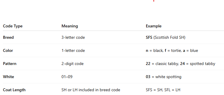 At PurrfectlyFold, kittens like Bella (SFS f 22 03) and Branson (SFS n 24 03) use these EMS codes to clearly communicate their pattern and color.